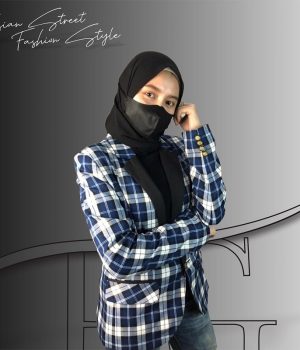 Menyediakan blazer kotak biru.